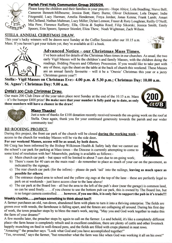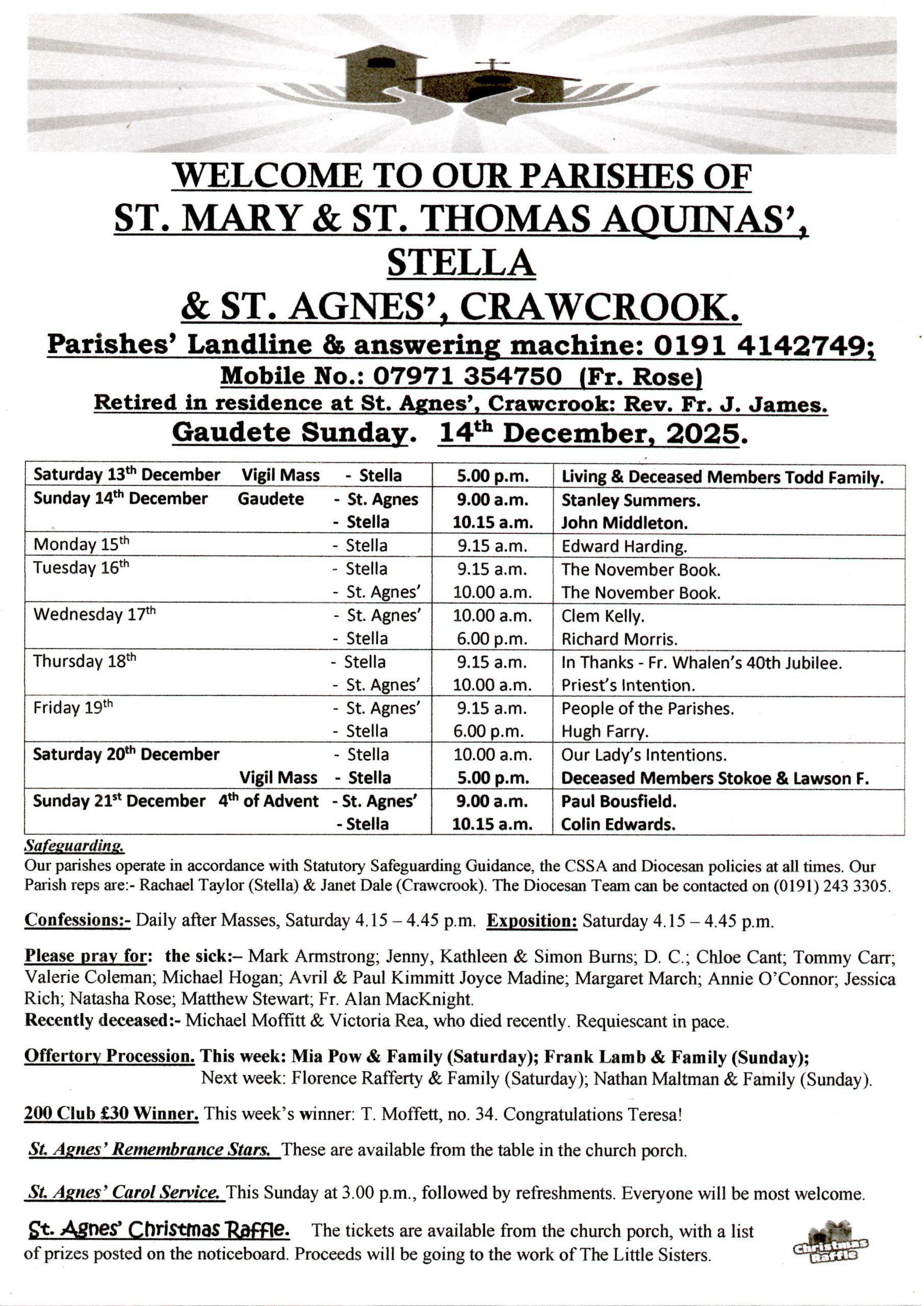 Retired in residence at St. Agnes’, Crawcrook: Rev. Fr. J. James.