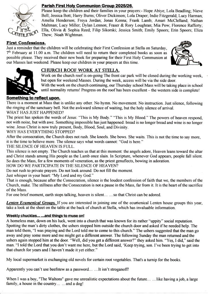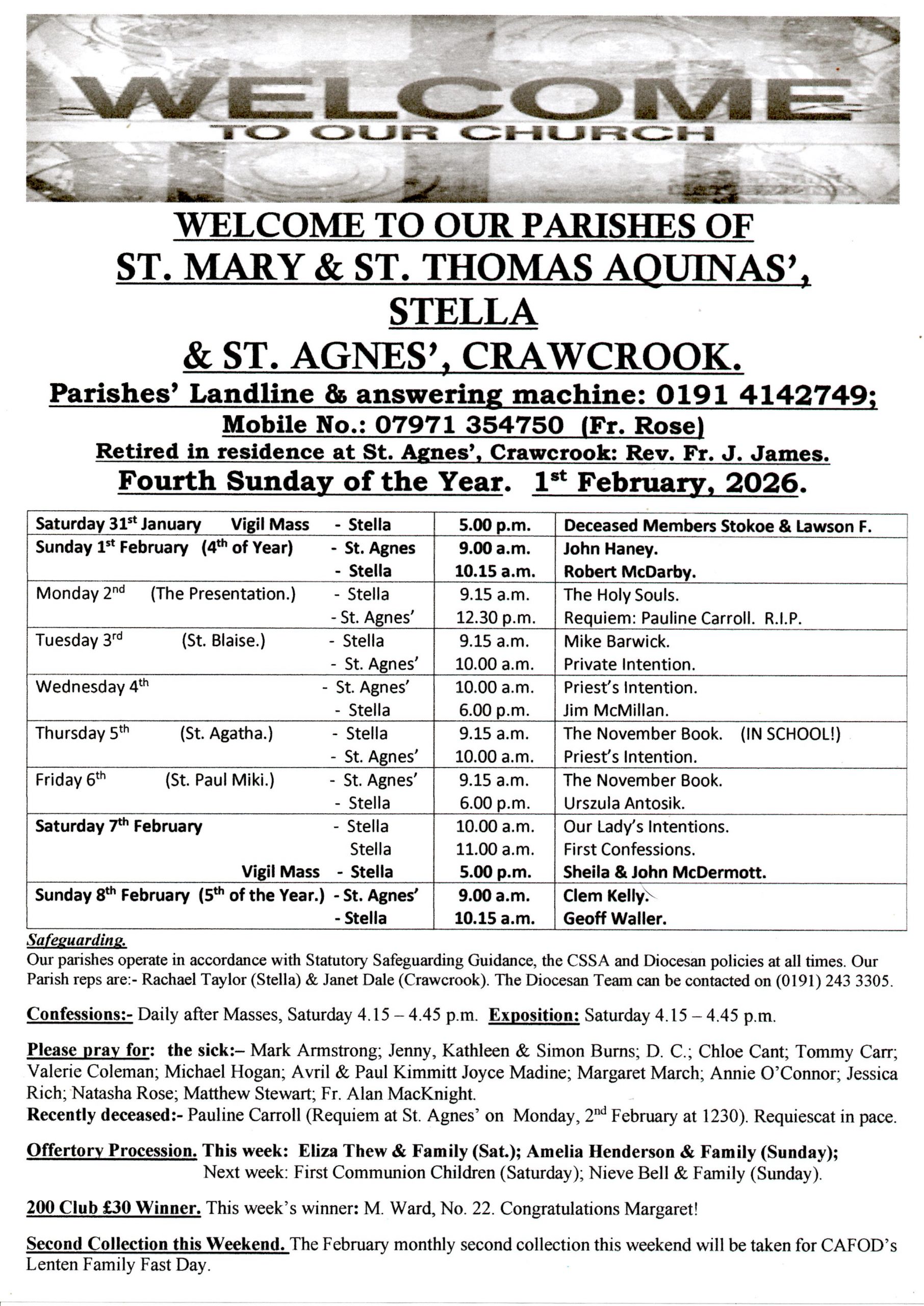 You can follow us on Facebook at Stella Church for news for St Mary & St Thomas Aquinas, Stella and St Agnes’, Crawcrook.